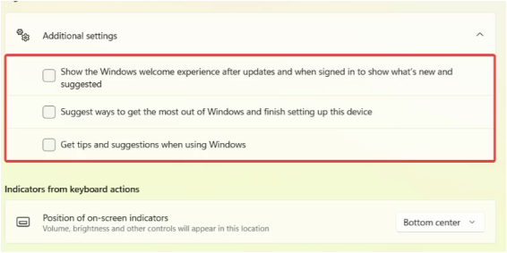 Vào Settings → System → Notifications → Additional settings → bỏ chọn 3 tùy chọn quảng cáo.