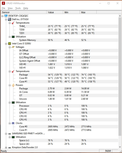 Các thông số đều được cập nhật theo thời gian thực, giúp bạn theo dõi sát sao hiệu năng và nhiệt độ của từng linh kiện. Bạn cũng sẽ thấy các cột Current (hiện tại), Min (thấp nhất), Max (cao nhất), rất hữu ích để đánh giá tình trạng hoạt động của máy trong quá trình sử dụng.