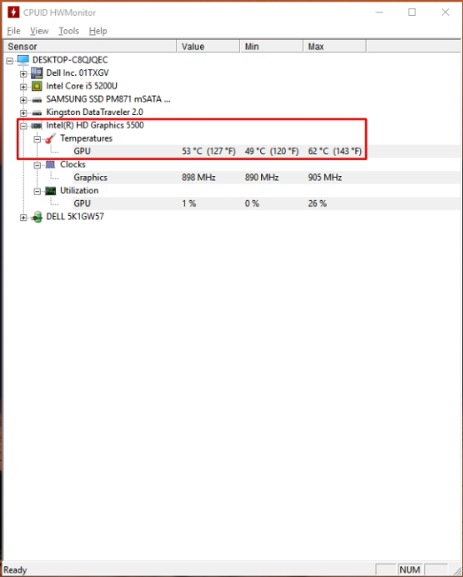 Tương tự CPU, để theo dõi nhiệt độ GPU, bạn cần nhấn vào tên card đồ họa trong danh sách phần cứng. Ví dụ, trên nhiều laptop phổ thông bạn sẽ thấy Intel(R) HD Graphics 5500, trong khi máy tính gaming sẽ hiển thị card rời NVIDIA/AMD.